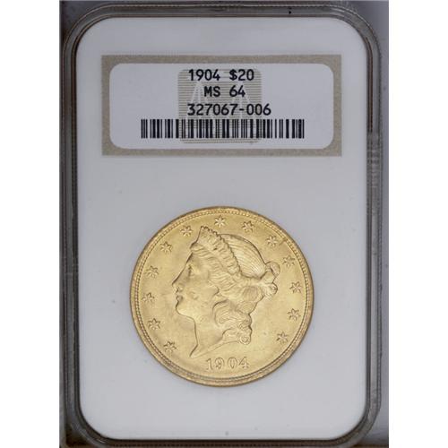 <B>1904<$20> MS64 NGC.</B></I> Sharply struck with gorgeous full luster and rich golden-orange color. For a near-Gem, this attractive piece exhibits a reasonable number of minor marks and luster grazes. <BR><BR><B>Important notice:</B> Heritage usually auctions material at the rate of 200-250 lots per hour. On some occasions eBay Live bid software or the Internet may not be able to keep up with the pace of the auction. We recommend placing a realistic absentee bid now as insurance to avoid disappointment. Occasionally the auctioneer may eliminate or reject an eBay Live bid, and the auctioneer may also reopen a lot after the close of the eBay live bidding (usually because we missed an audience bid), and may reject your bid even if it shows you as the winning bidder. By bidding via eBay Live, you agree that Heritage may award the lot to another bidder at its sole discretion under the circumstances described above or any other reasonable circumstances. Since eBay bids are not shown to us until we open the lot on the floor, we treat those bids just like floor bids. In most cases the floor responds before the eBay bid is presented to us, due to Internet lag time, so for consistency we have made it a policy that floor bids are always considered first over tie eBay live bids. Also please note that all Heritage lots purchased through eBay Live carry a 20% Buyer's Premium. Please make sure you read the Terms and Conditions before you bid. This lot is being auctioned in conjunction with a live floor auction by Heritage Galleries & Auctioneers. All final auction and invoice information will be supplied by Heritage Galleries & Auctioneers, and all other information should be considered preliminary. Lot:4464 <BR><BR><B>Winning Notification and Billing:</B> After the FINAL session in this auction is complete, Heritage will send e-mail and snail mail invoices. This process normally takes several days. All final auction and invoice information will be supplied by Heritage Galleries & Auctioneers, and all other information should be considered preliminary. <BR><BR>This auction will be conducted on a live auction floor and over the Internet through eBay Live. If you choose to place an absentee bid, please take a moment to <font color='#0000ff'><u><a href='http://pages.ebay.com/liveauctions/help/before/laabsentee.html'>learn how eBay Live absentee bidding works</a></u></font><font color='#000000'>