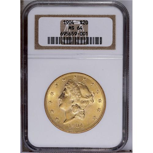<B>1904<$20> MS64 NGC.</B></I> Softly glowing luster underlies rich, copper-gold coloration on nearly blemish-free surfaces. The design elements are generally well struck up. <BR><BR><B>Important notice:</B> Heritage usually auctions material at the rate of 200-250 lots per hour. On some occasions eBay Live bid software or the Internet may not be able to keep up with the pace of the auction. We recommend placing a realistic absentee bid now as insurance to avoid disappointment. Occasionally the auctioneer may eliminate or reject an eBay Live bid, and the auctioneer may also reopen a lot after the close of the eBay live bidding (usually because we missed an audience bid), and may reject your bid even if it shows you as the winning bidder. By bidding via eBay Live, you agree that Heritage may award the lot to another bidder at its sole discretion under the circumstances described above or any other reasonable circumstances. Since eBay bids are not shown to us until we open the lot on the floor, we treat those bids just like floor bids. In most cases the floor responds before the eBay bid is presented to us, due to Internet lag time, so for consistency we have made it a policy that floor bids are always considered first over tie eBay live bids. Also please note that all Heritage lots purchased through eBay Live carry a 20% Buyer's Premium. Please make sure you read the Terms and Conditions before you bid. This lot is being auctioned in conjunction with a live floor auction by Heritage Galleries & Auctioneers. All final auction and invoice information will be supplied by Heritage Galleries & Auctioneers, and all other information should be considered preliminary. Lot:4453 <BR><BR><B>Winning Notification and Billing:</B> After the FINAL session in this auction is complete, Heritage will send e-mail and snail mail invoices. This process normally takes several days. All final auction and invoice information will be supplied by Heritage Galleries & Auctioneers, and all other information should be considered preliminary. <BR><BR>This auction will be conducted on a live auction floor and over the Internet through eBay Live. If you choose to place an absentee bid, please take a moment to <font color='#0000ff'><u><a href='http://pages.ebay.com/liveauctions/help/before/laabsentee.html'>learn how eBay Live absentee bidding works</a></u></font><font color='#000000'>