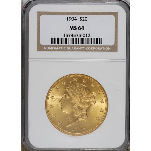 <B>1904 $20 MS64 NGC.</B></I> The 6.256 million plus 1904 double eagle is more plentiful than any other Liberty Head twenty, with hundreds of thousands of specimens extant (David Bowers, 2004). Potent luster emanates from the peach-gold surfaces of this near-Gem specimen, and the strike is solid. Some light obverse marks define the grade.<BR><BR><b>Shipping:</b> Coins & Currency (<a target="_blank" href="http://www.heritageauctions.com/common/shipping.php">view shipping information</a>)