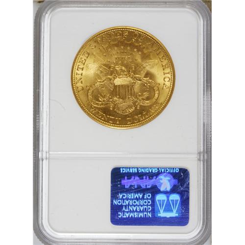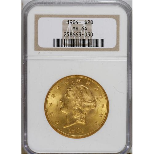 <B>1904 $20 MS64 NGC.</B></I> The borders exhibit lime tints, while the fields and devices are honey-gold. This lustrous and lightly marked near-Gem has pleasing eye appeal, and is a worthy addition to a quality gold type set.<BR><BR><b>Shipping:</b> Coins & Currency (<a target="_blank" href="http://www.heritageauctions.com/common/shipping.php">view shipping information</a>)