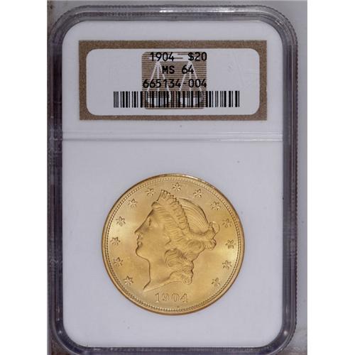 <B>1904 $20 MS64 NGC.</B></I> This coin boasts lustrous honey-gold surfaces, brilliant luster, and a good strike, just missing Gem designation because of a few trivial abrasions on the cheek of Liberty. The reverse has tinges of reddish-gold. An appealing coin.