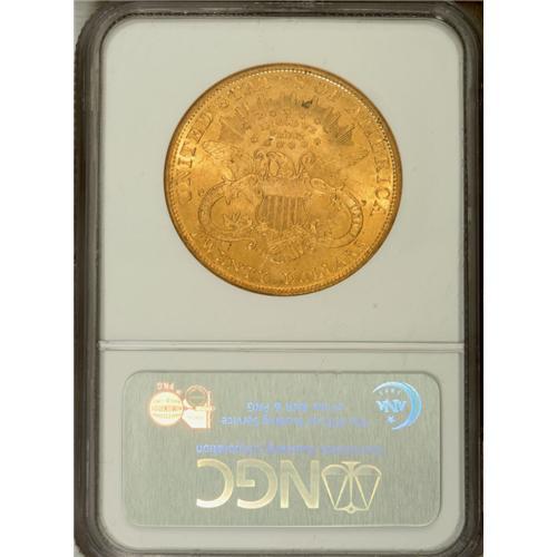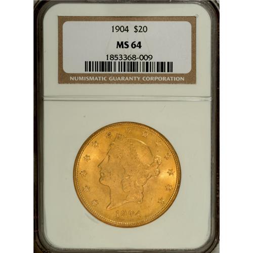 <B>1904 $20 MS64 NGC.</B></I> This is one of the most common dates in all of United States gold coinage, and makes an excellent choice for type purposes. This near-Gem displays distinctly matte-like, fine grain surface textures and lovely lime and peach-gold toning. Scattered dark-red specks limit the grade but not the Gemlike visual quality of the piece.<BR><BR><b>Shipping:</b> Coin/Currency (<a target="_blank" href="http://www.heritageauctions.com/common/shipping.php">view shipping information</a>)
