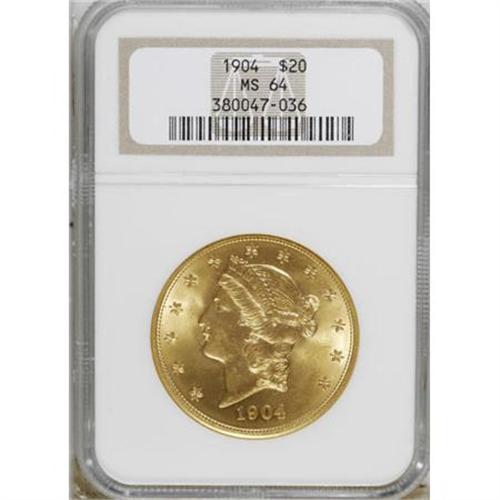 <B>1904 $20 MS64 NGC.</B></I> For type purposes, it would be challenging to find a Liberty double eagle in MS64 that offers more eye appeal than this example. From the bold strike, exceptionally clean surfaces, and full luster, this near-Gem has it all. <BR><BR><B>Coin Engraver:</B> James B. Longacre<BR><BR><b>Shipping:</b> Coins & Currency (<a target="_blank" href="http://www.heritageauctions.com/common/shipping.php">view shipping information</a>)