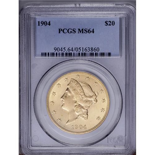 <B>1904<$20> MS64 PCGS.</B></I> A flashy and boldly struck near-Gem whose unblemished fields and devices ensure bountiful eye appeal. The 1904 is easily the most common P-mint Liberty twenty, but attractive Mint State pieces are subject to ceaseless demand.