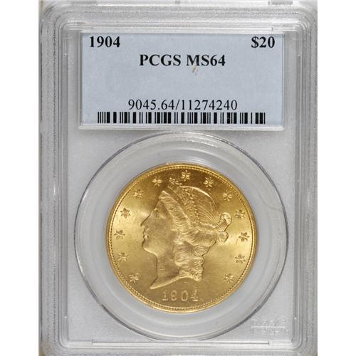 <B>1904 $20 MS64 PCGS.</B></I> A flashy near-Gem double eagle with peach-gold luster and sharply defined motifs. A few minor marks define the grade.<BR><BR><b>Shipping:</b> Coins & Currency (<a target="_blank" href="http://www.heritageauctions.com/common/shipping.php">view shipping information</a>)