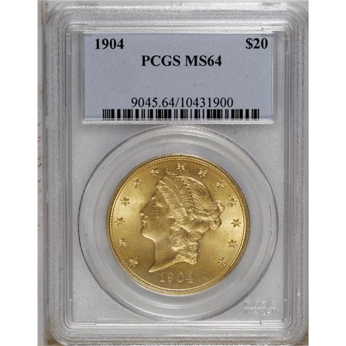 <B>1904 $20 MS64 PCGS.</B></I> A lovely butter-yellow near-Gem example of this popular type issue. The devices are solidly struck and clean, and the fields have just a few scattered marks.<BR><BR><b>Shipping:</b> Coin/Currency (<a target="_blank" href="http://www.heritageauctions.com/common/shipping.php">view shipping information</a>)