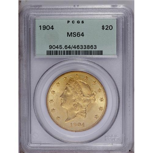 <B>1904<$20> MS64 PCGS.</B></I> A lustrous and bright honey-gold older holder near-Gem. Precisely struck and attractively preserved. A worthy large denomination gold type coin.