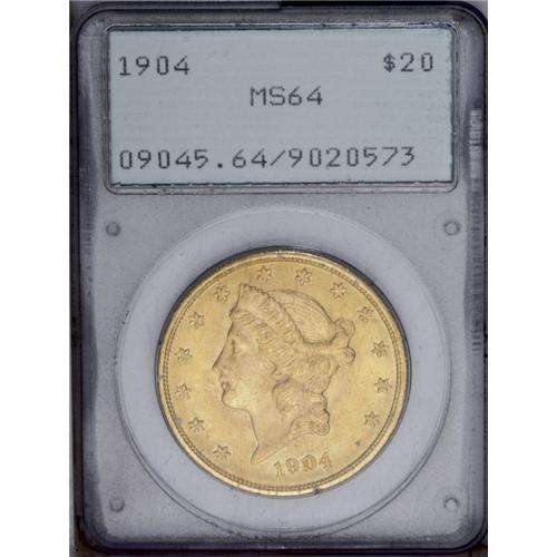 <B>1904 $20 MS64 PCGS.</B></I> A lustrous canary-gold type coin with a beautifully preserved reverse and only a few distributed ticks on the obverse. Encased in an early small-size PCGS holder.