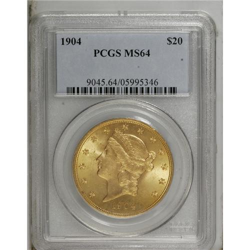<B>1904 $20 MS64 PCGS.</B></I> A near Gem level coin with tremendous eye appeal. The strike is full and the surfaces have bright yellow surfaces on the obverse with blending colors of yellow on the reverse.<BR><BR><b>Shipping:</b> Coin/Currency (<a target="_blank" href="http://www.heritageauctions.com/common/shipping.php">view shipping information</a>)