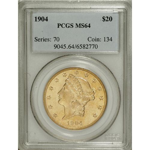 <B>1904 $20 MS64 PCGS.</B></I> A prooflike lemon-gold near-Gem with flashy fields and pleasing eye appeal. A good selection for a quality gold type set. DOLLARS is minutely die doubled.<BR><BR><b>Shipping:</b> Coins & Currency (<a target="_blank" href="http://www.heritageauctions.com/common/shipping.php">view shipping information</a>)