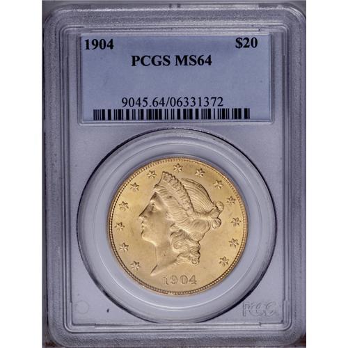 "1904 $20 MS64 PCGS. A satiny near-Gem, "