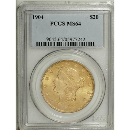 <B>1904 $20 MS64 PCGS.</B></I> A satiny orange-gold representative of this popular type issue that has more potent luster on the reverse. Lightly marked overall with solid eye appeal.<BR><BR><b>Shipping:</b> Coins & Currency (<a target="_blank" href="http://www.heritageauctions.com/common/shipping.php">view shipping information</a>)