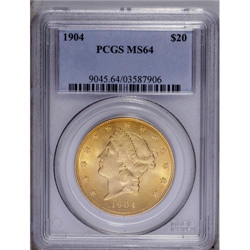 <B>1904<$20> MS64 PCGS.</B></I> A sharply struck and lustrous near-Gem that has attractive apricot-gold color and carefully preserved surfaces. While the 1904 is the most common issue in the series, most survivors are notably bagmarked, unlike the present example.