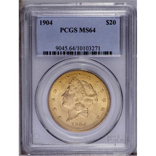<B>1904<$20> MS64 PCGS.</B></I> A typically well struck and lustrous example of this common date. The coloration is a little deeper than usual, and quite attractive. The few wispy marks are minimal for the grade. An attractive, premium quality near-Gem. <BR><BR><B>Important notice:</B> Heritage usually auctions material at the rate of 200-250 lots per hour. On some occasions eBay Live bid software or the Internet may not be able to keep up with the pace of the auction. We recommend placing a realistic absentee bid now as insurance to avoid disappointment. Occasionally the auctioneer may eliminate or reject an eBay Live bid, and the auctioneer may also reopen a lot after the close of the eBay live bidding (usually because we missed an audience bid), and may reject your bid even if it shows you as the winning bidder. By bidding via eBay Live, you agree that Heritage may award the lot to another bidder at its sole discretion under the circumstances described above or any other reasonable circumstances. Since eBay bids are not shown to us until we open the lot on the floor, we treat those bids just like floor bids. In most cases the floor responds before the eBay bid is presented to us, due to Internet lag time, so for consistency we have made it a policy that floor bids are always considered first over tie eBay live bids. Also please note that all Heritage lots purchased through eBay Live carry a 20% Buyer's Premium. Please make sure you read the Terms and Conditions before you bid. This lot is being auctioned in conjunction with a live floor auction by Heritage Galleries & Auctioneers. All final auction and invoice information will be supplied by Heritage Galleries & Auctioneers, and all other information should be considered preliminary. Lot:4444 <BR><BR><B>Winning Notification and Billing:</B> After the FINAL session in this auction is complete, Heritage will send e-mail and snail mail invoices. This process normally takes several days. All final auction and invoice information will be supplied by Heritage Galleries & Auctioneers, and all other information should be considered preliminary. <BR><BR>This auction will be conducted on a live auction floor and over the Internet through eBay Live. If you choose to place an absentee bid, please take a moment to <font color='#0000ff'><u><a href='http://pages.ebay.com/liveauctions/help/before/laabsentee.html'>learn how eBay Live absentee bidding works</a></u></font><font color='#000000'>