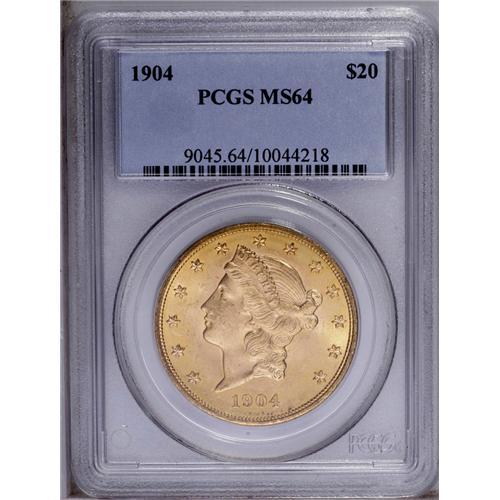 <B>1904<$20> MS64 PCGS.</B></I> Attractive apricot-gold surfaces yield vibrant luster and sharply struck design features. Minute marks on Liberty's cheek and in the fields of both sides limit the grade.