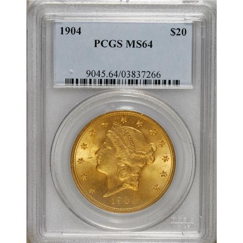 <B>1904 $20 MS64 PCGS.</B></I> Beautiful apricot-gold and lime-green patination adorns radiantly lustrous surfaces, and razor-sharp delineation characterizes the design features. While a handful of obverse marks limits the grade, this near-Gem projects fantastic eye appeal. The 1904 is the most common date of the series, rendering it popular among type collectors.<BR><BR><b>Shipping:</b> Coins & Currency (<a target="_blank" href="http://www.heritageauctions.com/common/shipping.php">view shipping information</a>)