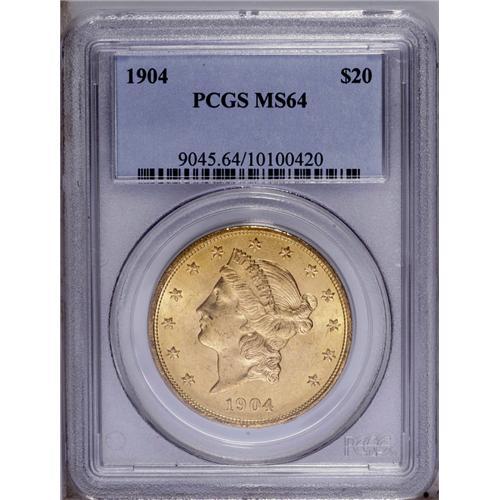 <B>1904<$20> MS64 PCGS.</B></I> Boasting the typically full striking details, dynamic luster and rich toning that this well produced issue is famous for, this is a visually pleasing and technically impressive near-Gem. A few stray marks keep it from an even higher grade assessment.