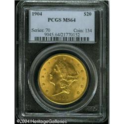 1904 $20 MS64 PCGS. Boldly struck with great luste <B>1904 $20 MS64 PCGS.</B></I> Boldly struck with great luster, beautiful orange-gold and green toning, and a few trivial marks on Liberty's cheek. A very solid near-Gem. <BR><BR><B>Important notice:</B> Heritage usually auctions material at the rate of 200-250 lots per hour. On some occasions eBay Live bid software or the Internet may not be able to keep up with the pace of the auction. We recommend placing a realistic absentee bid now as insurance to avoid disappointment. Occasionally the auctioneer may eliminate or reject an eBay Live bid, and the auctioneer may also reopen a lot after the close of the eBay live bidding (usually because we missed an audience bid), and may reject your bid even if it shows you as the winning bidder. By bidding via eBay Live, you agree that Heritage may award the lot to another bidder at its sole discretion under the circumstances described above or any other reasonable circumstances. Since eBay bids are not shown to us until we open the lot on the floor, we treat those bids just like floor bids. In most cases the floor responds before the eBay bid is presented to us, due to Internet lag time, so for consistency we have made it a policy that floor bids are always considered first over tie eBay live bids. Also please note that all Heritage lots purchased through eBay Live carry a 20% Buyer's Premium. Please make sure you read the Terms and Conditions before you bid. This lot is being auctioned in conjunction with a live floor auction by Heritage Galleries & Auctioneers. All final auction and invoice information will be supplied by Heritage Galleries & Auctioneers, and all other information should be considered preliminary. Lot:7040