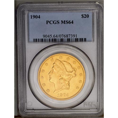 <B>1904<$20> MS64 PCGS.</B></I> Bright luster jumps out at the viewer on this peach-gold near-Gem. Exquisite definition is visible on the design elements, further enhancing the coin's desirability. The grade would certainly be higher were it not for some tiny marks on the cheek and neck.