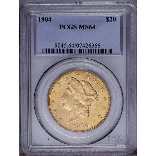 <B>1904<$20> MS64 PCGS.</B></I> Bright satiny surfaces reveal sharply struck features and light orange-gold color. Wispy marks on Liberty's cheek, and in the right obverse field, limit the grade.