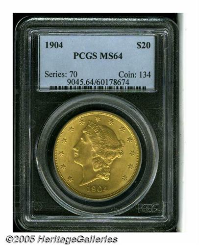 <B>1904<$20> MS64 PCGS.</B></I> Brilliant yellow-gold color with frosty luster. This is an appealing example with exceptional surfaces quality for the grade.