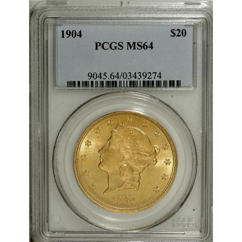 <B>1904 $20 MS64 PCGS.</B></I> Choice and solidly struck with vibrant luster. This attractive yellow-orange piece is a strong candidate for a 20th century gold type set.<BR><BR><b>Shipping:</b> Coins & Currency (<a target="_blank" href="http://www.heritageauctions.com/common/shipping.php">view shipping information</a>)
