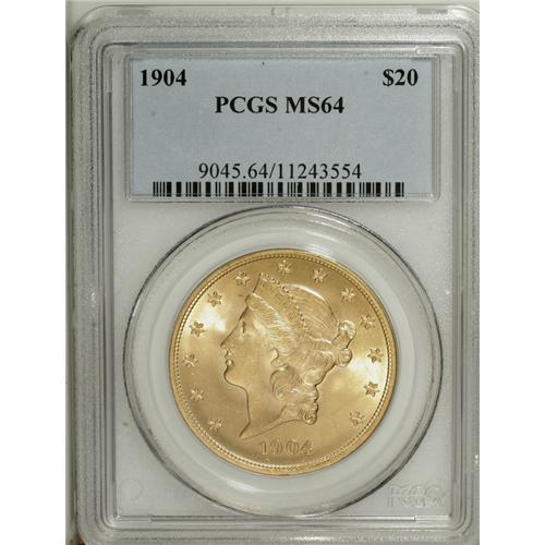 <B>1904 $20 MS64 PCGS.</B></I> Choice with excellent detail. The highly lustrous and minimally marked surfaces are yellow-gold in the centers with a shift to greenish-gold near the rims.<BR><BR><b>Shipping:</b> Coins & Currency (<a target="_blank" href="http://www.heritageauctions.com/common/shipping.php">view shipping information</a>)