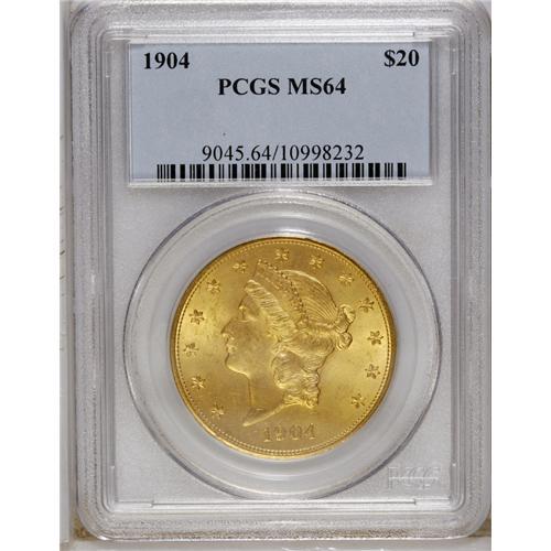 <B>1904 $20 MS64 PCGS.</B></I> Choice with softly lustrous orange-gold surfaces that have a handful of small marks. Appealing peach accents are present in the reverse fields.<BR><BR><b>Shipping:</b> Coin/Currency (<a target="_blank" href="http://www.heritageauctions.com/common/shipping.php">view shipping information</a>)