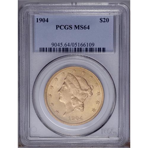 <B>1904<$20> MS64 PCGS.</B></I> Dusky apricot centers are framed by blushes of subtle lime patina. A pleasing near-Gem that has an especially unabraded reverse. The most common issue of the series, but nonetheless popular in better Mint State grades.