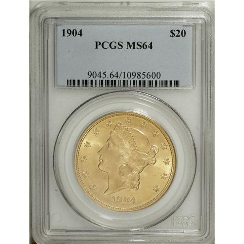 <B>1904 $20 MS64 PCGS.</B></I> Exquisitely struck with vibrant luster and appealing yellow-orange surfaces. Clean overall, though a curved line of reeding grazes runs from the date to the star to the right.<BR><BR><b>Shipping:</b> Coin/Currency (<a target="_blank" href="http://www.heritageauctions.com/common/shipping.php">view shipping information</a>)