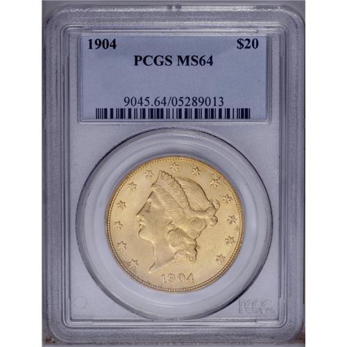 <B>1904<$20> MS64 PCGS.</B></I> Fully lustrous with lovely olive-gold coloration and minimal surface marks. Somewhat softly struck on the central devices.