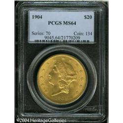 1904 $20 MS64 PCGS. Fully struck with bright, fros <B>1904 $20 MS64 PCGS.</B></I> Fully struck with bright, frosty luster, rich color, a few small contact marks on the obverse, and a virtually pristine reverse. Very, very close to Gem quality. <BR><BR><B>Important notice:</B> Heritage usually auctions material at the rate of 200-250 lots per hour. On some occasions eBay Live bid software or the Internet may not be able to keep up with the pace of the auction. We recommend placing a realistic absentee bid now as insurance to avoid disappointment. Occasionally the auctioneer may eliminate or reject an eBay Live bid, and the auctioneer may also reopen a lot after the close of the eBay live bidding (usually because we missed an audience bid), and may reject your bid even if it shows you as the winning bidder. By bidding via eBay Live, you agree that Heritage may award the lot to another bidder at its sole discretion under the circumstances described above or any other reasonable circumstances. Since eBay bids are not shown to us until we open the lot on the floor, we treat those bids just like floor bids. In most cases the floor responds before the eBay bid is presented to us, due to Internet lag time, so for consistency we have made it a policy that floor bids are always considered first over tie eBay live bids. Also please note that all Heritage lots purchased through eBay Live carry a 20% Buyer's Premium. Please make sure you read the Terms and Conditions before you bid. This lot is being auctioned in conjunction with a live floor auction by Heritage Galleries & Auctioneers. All final auction and invoice information will be supplied by Heritage Galleries & Auctioneers, and all other information should be considered preliminary. Lot:7037