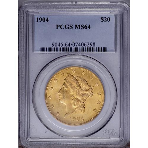 <B>1904<$20> MS64 PCGS.</B></I> Green-gold and peach hues endow this lustrous and attractively struck Liberty double eagle. A pair of slender marks near the nose, otherwise a lovely near-Gem.