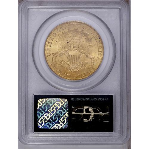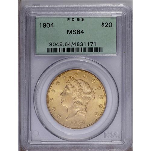 <B>1904 $20 MS64 PCGS.</B></I> Lime and apricot colors are brightened by prominent cartwheel luster. This well struck and lightly abraded piece has a few small specks of dark debris on the reverse. Encapsulated in a green label holder.