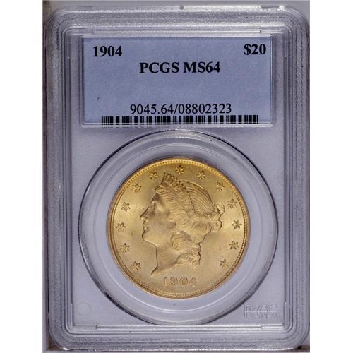 <B>1904<$20> MS64 PCGS.</B></I> Mint-green and peach-red toning adorns the lustrous surfaces. A well struck and carefully preserved near-Gem. <BR><BR><B>Important notice:</B> Heritage usually auctions material at the rate of 200-250 lots per hour. On some occasions eBay Live bid software or the Internet may not be able to keep up with the pace of the auction. We recommend placing a realistic absentee bid now as insurance to avoid disappointment. Occasionally the auctioneer may eliminate or reject an eBay Live bid, and the auctioneer may also reopen a lot after the close of the eBay live bidding (usually because we missed an audience bid), and may reject your bid even if it shows you as the winning bidder. By bidding via eBay Live, you agree that Heritage may award the lot to another bidder at its sole discretion under the circumstances described above or any other reasonable circumstances. Since eBay bids are not shown to us until we open the lot on the floor, we treat those bids just like floor bids. In most cases the floor responds before the eBay bid is presented to us, due to Internet lag time, so for consistency we have made it a policy that floor bids are always considered first over tie eBay live bids. Also please note that all Heritage lots purchased through eBay Live carry a 20% Buyer's Premium. Please make sure you read the Terms and Conditions before you bid. This lot is being auctioned in conjunction with a live floor auction by Heritage Galleries & Auctioneers. All final auction and invoice information will be supplied by Heritage Galleries & Auctioneers, and all other information should be considered preliminary. Lot:4452 <BR><BR><B>Winning Notification and Billing:</B> After the FINAL session in this auction is complete, Heritage will send e-mail and snail mail invoices. This process normally takes several days. All final auction and invoice information will be supplied by Heritage Galleries & Auctioneers, and all other information should be considered preliminary. <BR><BR>This auction will be conducted on a live auction floor and over the Internet through eBay Live. If you choose to place an absentee bid, please take a moment to <font color='#0000ff'><u><a href='http://pages.ebay.com/liveauctions/help/before/laabsentee.html'>learn how eBay Live absentee bidding works</a></u></font><font color='#000000'>