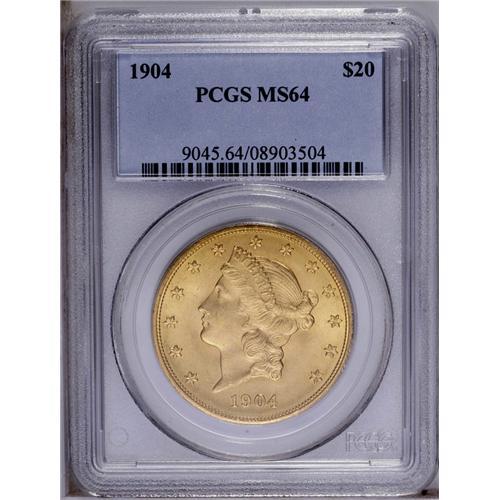 <B>1904<$20> MS64 PCGS.</B></I> Satiny apricot-gold surfaces radiate glowing luster, and exhibit sharply impressed design features. Minute marks on Liberty's cheek and in the left obverse field define the grade. <BR><BR><B>Important notice:</B> Heritage usually auctions material at the rate of 200-250 lots per hour. On some occasions eBay Live bid software or the Internet may not be able to keep up with the pace of the auction. We recommend placing a realistic absentee bid now as insurance to avoid disappointment. Occasionally the auctioneer may eliminate or reject an eBay Live bid, and the auctioneer may also reopen a lot after the close of the eBay live bidding (usually because we missed an audience bid), and may reject your bid even if it shows you as the winning bidder. By bidding via eBay Live, you agree that Heritage may award the lot to another bidder at its sole discretion under the circumstances described above or any other reasonable circumstances. Since eBay bids are not shown to us until we open the lot on the floor, we treat those bids just like floor bids. In most cases the floor responds before the eBay bid is presented to us, due to Internet lag time, so for consistency we have made it a policy that floor bids are always considered first over tie eBay live bids. Also please note that all Heritage lots purchased through eBay Live carry a 20% Buyer's Premium. Please make sure you read the Terms and Conditions before you bid. This lot is being auctioned in conjunction with a live floor auction by Heritage Galleries & Auctioneers. All final auction and invoice information will be supplied by Heritage Galleries & Auctioneers, and all other information should be considered preliminary. Lot:4448 <BR><BR><B>Winning Notification and Billing:</B> After the FINAL session in this auction is complete, Heritage will send e-mail and snail mail invoices. This process normally takes several days. All final auction and invoice information will be supplied by Heritage Galleries & Auctioneers, and all other information should be considered preliminary. <BR><BR>This auction will be conducted on a live auction floor and over the Internet through eBay Live. If you choose to place an absentee bid, please take a moment to <font color='#0000ff'><u><a href='http://pages.ebay.com/liveauctions/help/before/laabsentee.html'>learn how eBay Live absentee bidding works</a></u></font><font color='#000000'>