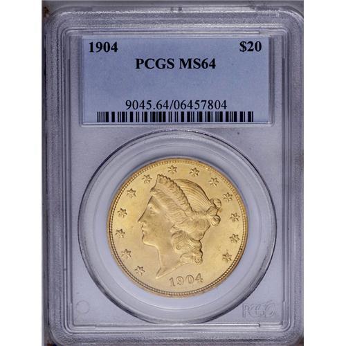 <B>1904<$20> MS64 PCGS.</B></I> Satiny with lovely lime-green and peach toning. Typically well struck with a few minor blemishes on the obverse.