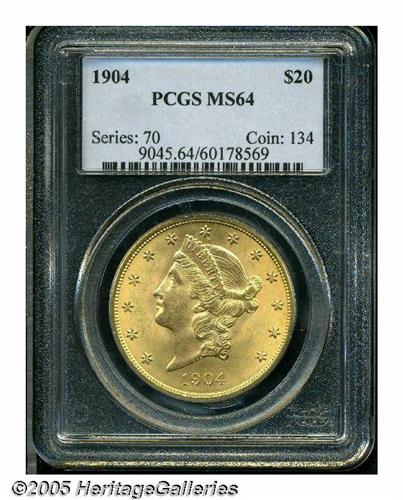 <B>1904<$20> MS64 PCGS.</B></I> Sharply struck and fully brilliant with frosty yellow-gold luster. Just a couple minor scuffs on Liberty's cheek, and in the fields, prevent a Gem grade for this beauty.