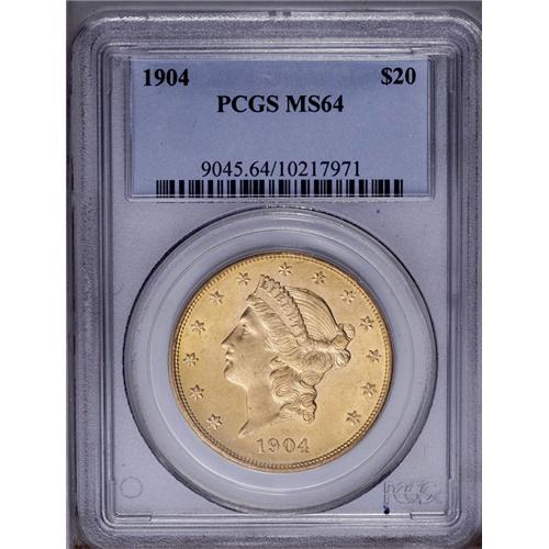 <B>1904 $20 MS64 PCGS.</B></I> Sharply struck with even honey-gold color, shimmering luster, and a few wispy marks on each side. An appealing piece that is well-suited for a type or date set.<BR><BR><b>Shipping:</b> Coin/Currency (<a target="_blank" href="http://www.heritageauctions.com/common/shipping.php">view shipping information</a>)