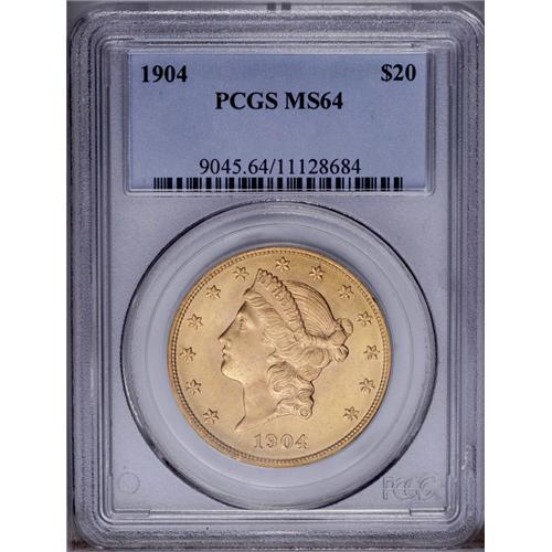 <B>1904<$20> MS64 PCGS.</B></I> Shimmering luster and lovely peach-gold toning guarantee the eye appeal of this attractive near-Gem. Fully struck with a few wispy obverse field marks.
