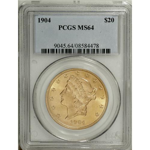 <B>1904 $20 MS64 PCGS.</B></I> Strongly lustrous with peach overtones to the yellow-gold surfaces. Both the central and peripheral devices display exceptional detail.<BR><BR><b>Shipping:</b> Coin/Currency (<a target="_blank" href="http://www.heritageauctions.com/common/shipping.php">view shipping information</a>)