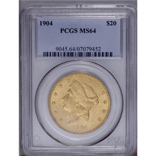 <B>1904 $20 MS64 PCGS.</B></I> Subdued luster and greenish-gold color, attractive but softly struck on the letter tops of LIBERTY. Scrutiny reveals a few light ticks on Liberty's cheek and neck.