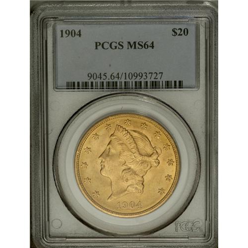 <B>1904 $20 MS64 PCGS.</B></I> Suitably struck with vivid gold-orange surfaces and attractive luster. A handful of light abrasions in the left obverse field preclude a Gem grade.<BR><BR><b>Shipping:</b> Coin/Currency (<a target="_blank" href="http://www.heritageauctions.com/common/shipping.php">view shipping information</a>)