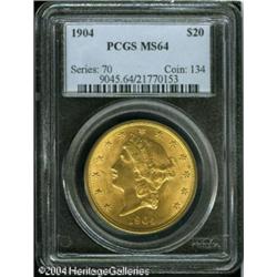 1904 $20 MS64 PCGS. The reverse of this apricot-go <B>1904 $20 MS64 PCGS.</B></I> The reverse of this apricot-gold Liberty Double Eagle is magnificently preserved, and only the faintest luster grazes are on the obverse. The holder above the obverse has a wispy L-shaped scratch that has no effect on the coin itself. <BR><BR><B>Important notice:</B> Heritage usually auctions material at the rate of 200-250 lots per hour. On some occasions eBay Live bid software or the Internet may not be able to keep up with the pace of the auction. We recommend placing a realistic absentee bid now as insurance to avoid disappointment. Occasionally the auctioneer may eliminate or reject an eBay Live bid, and the auctioneer may also reopen a lot after the close of the eBay live bidding (usually because we missed an audience bid), and may reject your bid even if it shows you as the winning bidder. By bidding via eBay Live, you agree that Heritage may award the lot to another bidder at its sole discretion under the circumstances described above or any other reasonable circumstances. Since eBay bids are not shown to us until we open the lot on the floor, we treat those bids just like floor bids. In most cases the floor responds before the eBay bid is presented to us, due to Internet lag time, so for consistency we have made it a policy that floor bids are always considered first over tie eBay live bids. Also please note that all Heritage lots purchased through eBay Live carry a 20% Buyer's Premium. Please make sure you read the Terms and Conditions before you bid. This lot is being auctioned in conjunction with a live floor auction by Heritage Galleries & Auctioneers. All final auction and invoice information will be supplied by Heritage Galleries & Auctioneers, and all other information should be considered preliminary. Lot:7035