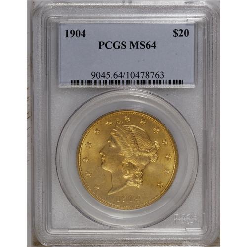 <B>1904<$20> MS64 PCGS.</B></I> The squash-yellow fields have ample luster, and the yellow-gold devices have solid definition. Minor, scattered marks appear on the surfaces.