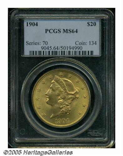 <B>1904<$20> MS64 PCGS.</B></I> The surfaces of this near Gem are impeccably preserved, and display glowing luster and pleasing peach-gold patina. The design elements are sharply struck throughout, further enhancing the coin's overall eye appeal. The couple of marks that do appear are minor.