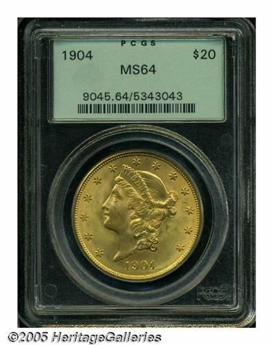 <B>1904<$20> MS64 PCGS.</B></I> This 1904 double eagle is sharply defined with scintillating mint luster and bright greenish-gold patina. A few minute marks on Liberty's cheek limit the grade.