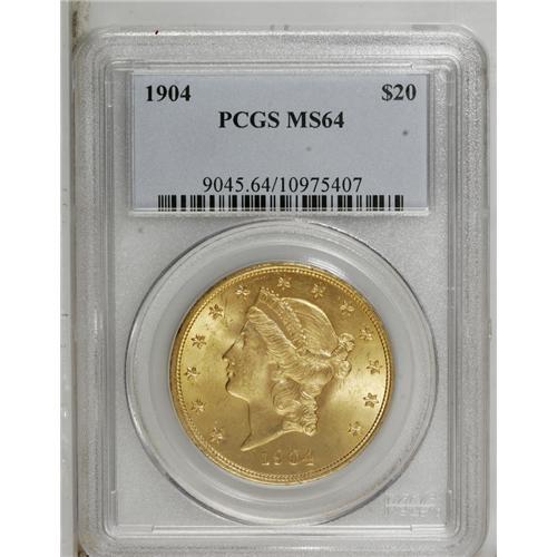 <B>1904 $20 MS64 PCGS.</B></I> This attractive near-Gem has lustrous yellow-orange surfaces and suitably detailed devices. Though light marks combine to limit the grade, the overall eye appeal is high.<BR><BR><b>Shipping:</b> Coin/Currency (<a target="_blank" href="http://www.heritageauctions.com/common/shipping.php">view shipping information</a>)