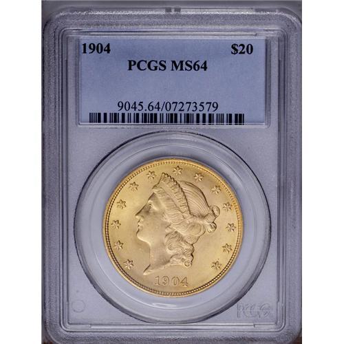 <B>1904<$20> MS64 PCGS.</B></I> This beautiful Liberty twenty dollar piece has radiant luster and seamless surfaces. Blended lime and apricot tints are interrupted solely by a small alloy spot in front of the eagle's lower neck.