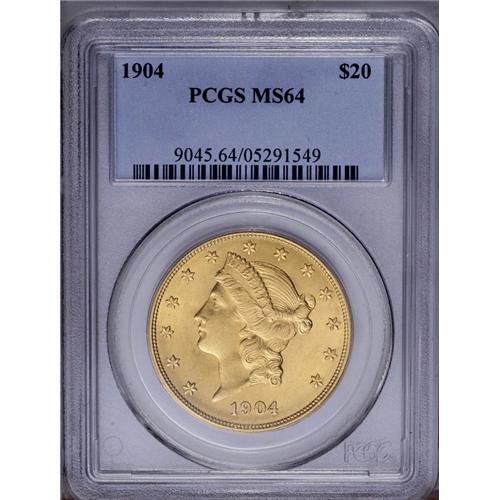 <B>1904<$20> MS64 PCGS.</B></I> This handsome apricot-gold near-Gem gives the initial impression of a finer grade. Close evaluation locates a thin, intermittent, diagonal mark on the upper central reverse.